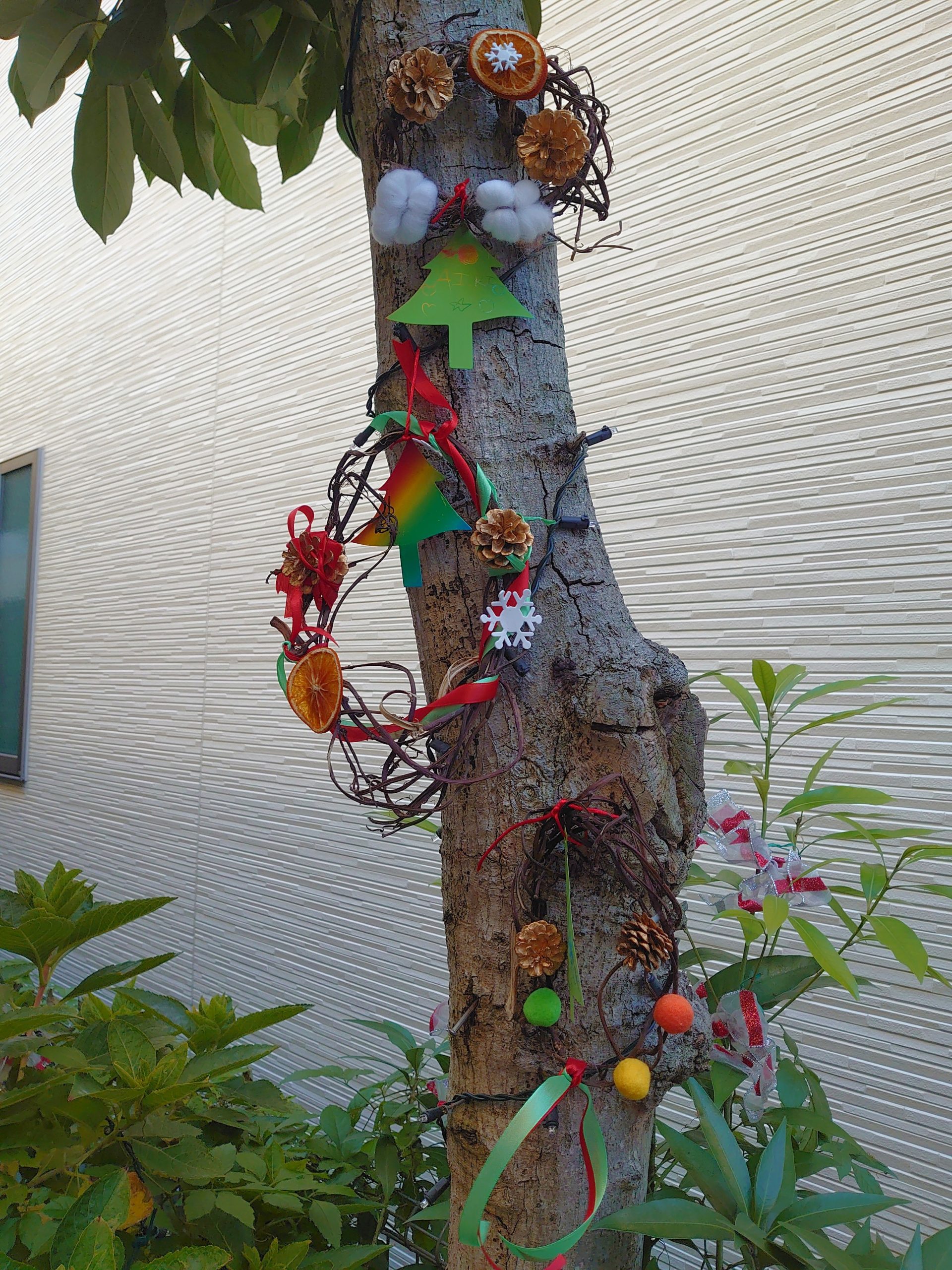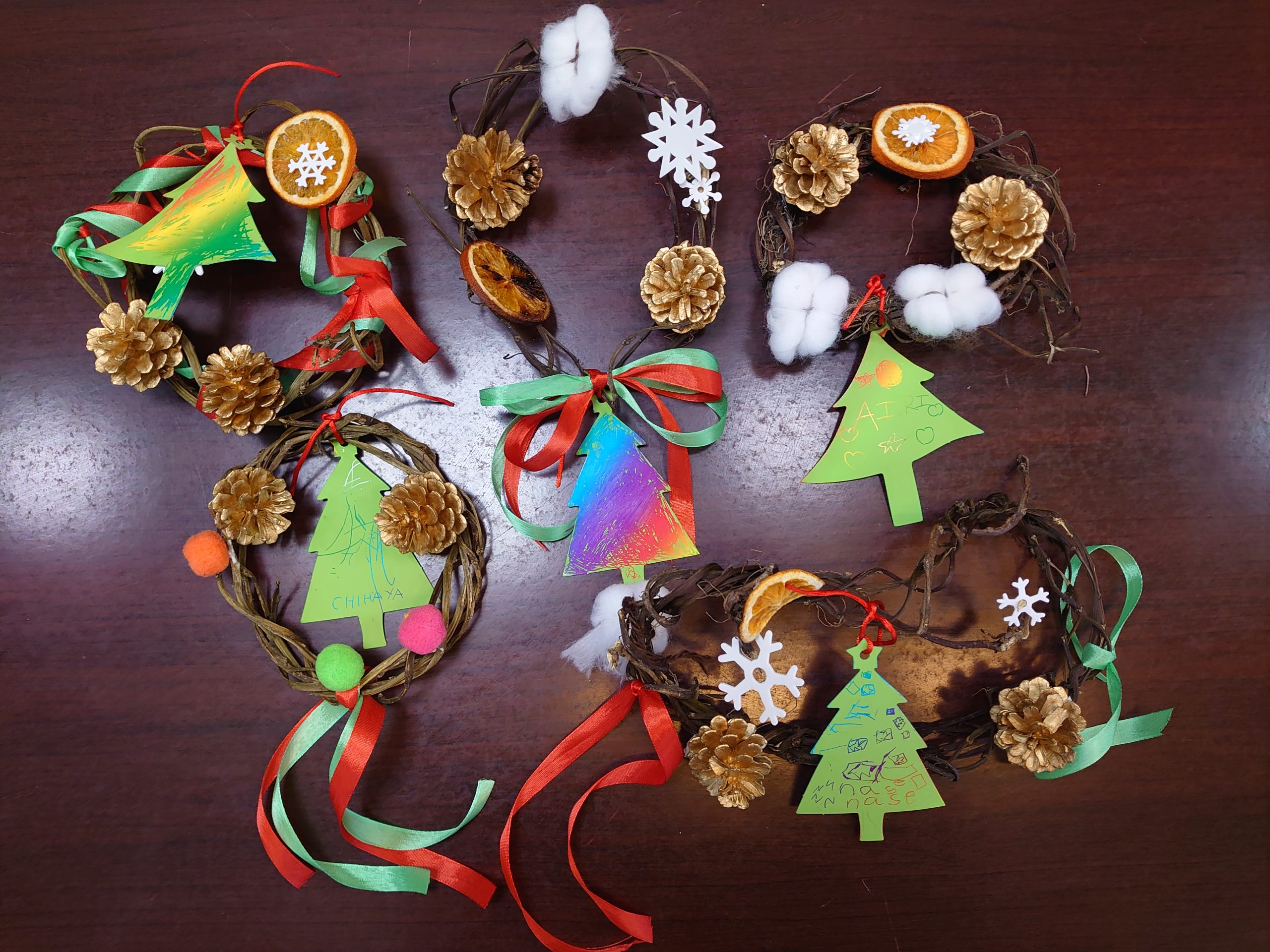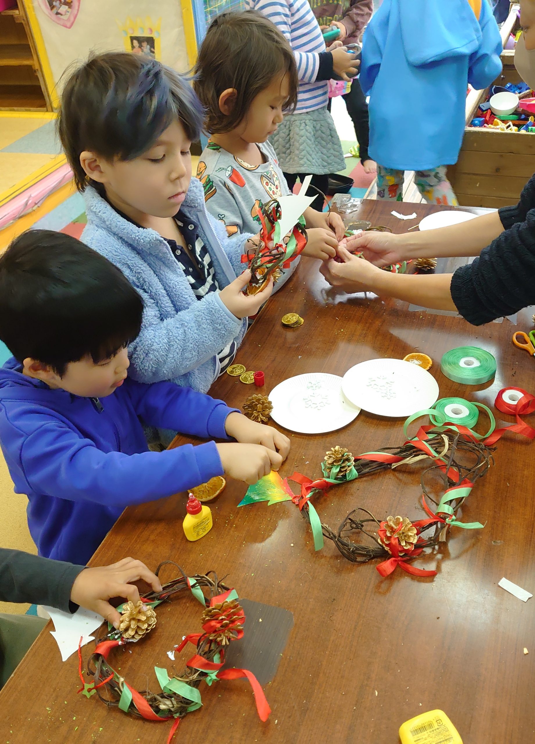 12/5芋蔓でクリスマスリースを製作しました 2024/12/07 先日は、芋蔓リースのご持参にご協力頂きましてありがとうございました。 工作の時間に製作し、金曜日に持ち帰らせています。お家でもクリスマス飾りの仲間入りをして下さいね🎄 リース作りでは金色の松ぼっくりや、雪の結晶の形、リボン、ドライオレンジ、綿花の造花などをボンドでくっつけて製作しました。 年中クラス、年長クラスの子は自分で全部、製作する子もいて、試行錯誤しながらボンドで付けていました。朝顔の蔓でも繊細なリースを作れるようなので、来秋はお家でもtryしてみるのも良いですね。