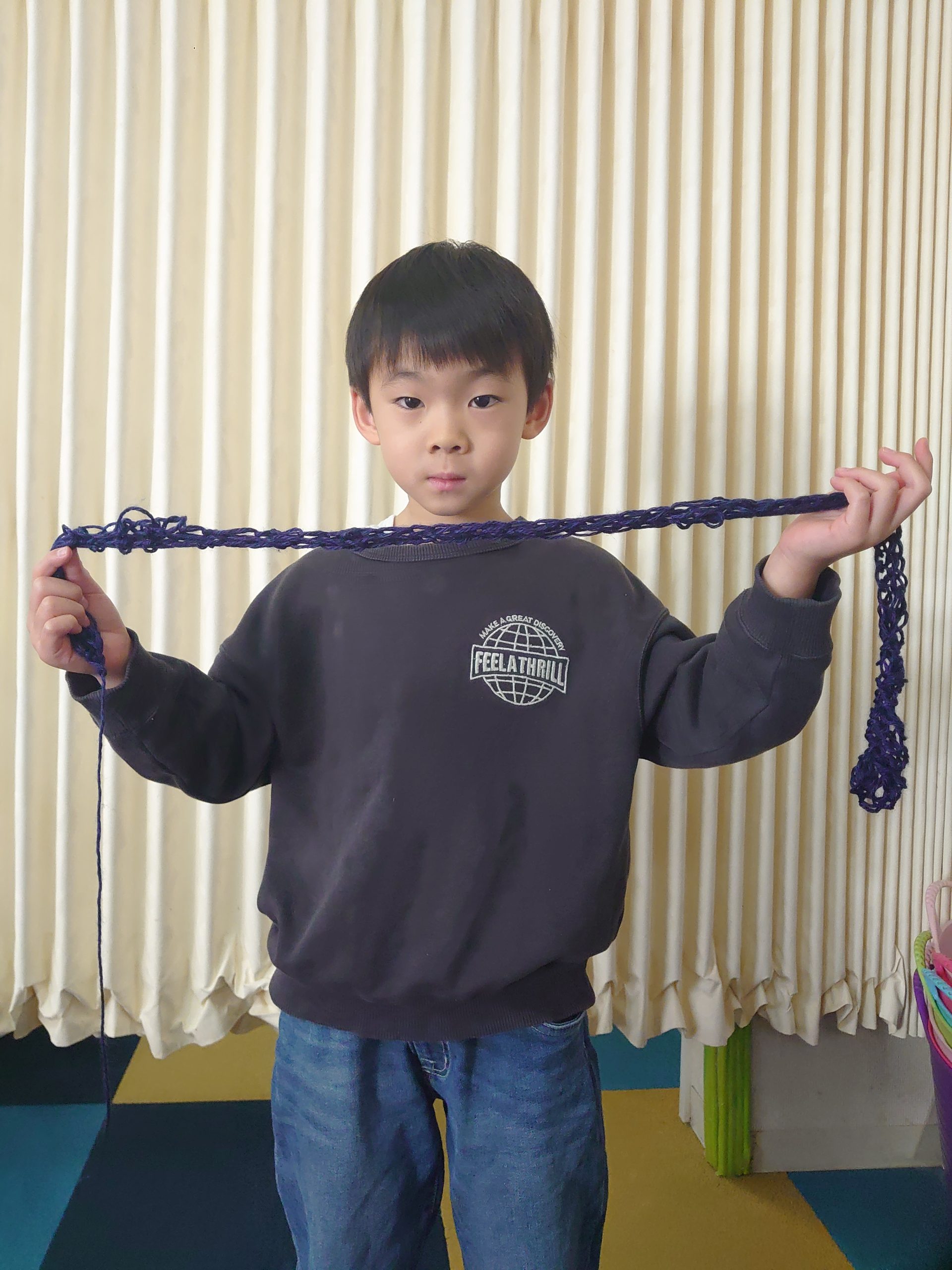 2週目は三つ編みでウォーミングアップした年中クラスの子も指編みに取り組みました。「うわ~楽しい!家に持って帰っていい!?」「もっとやりたい!」「僕、マフラー欲しかったんだよね!」と目を輝かせる子供達。最初は不器用だったり、先生の指導も上の空で聞いてる姿があっても、何度も間違いに戻って失敗しても、完成させたい!という子供の意欲が最後は上手な指編みマフラーに仕上がりました✨
