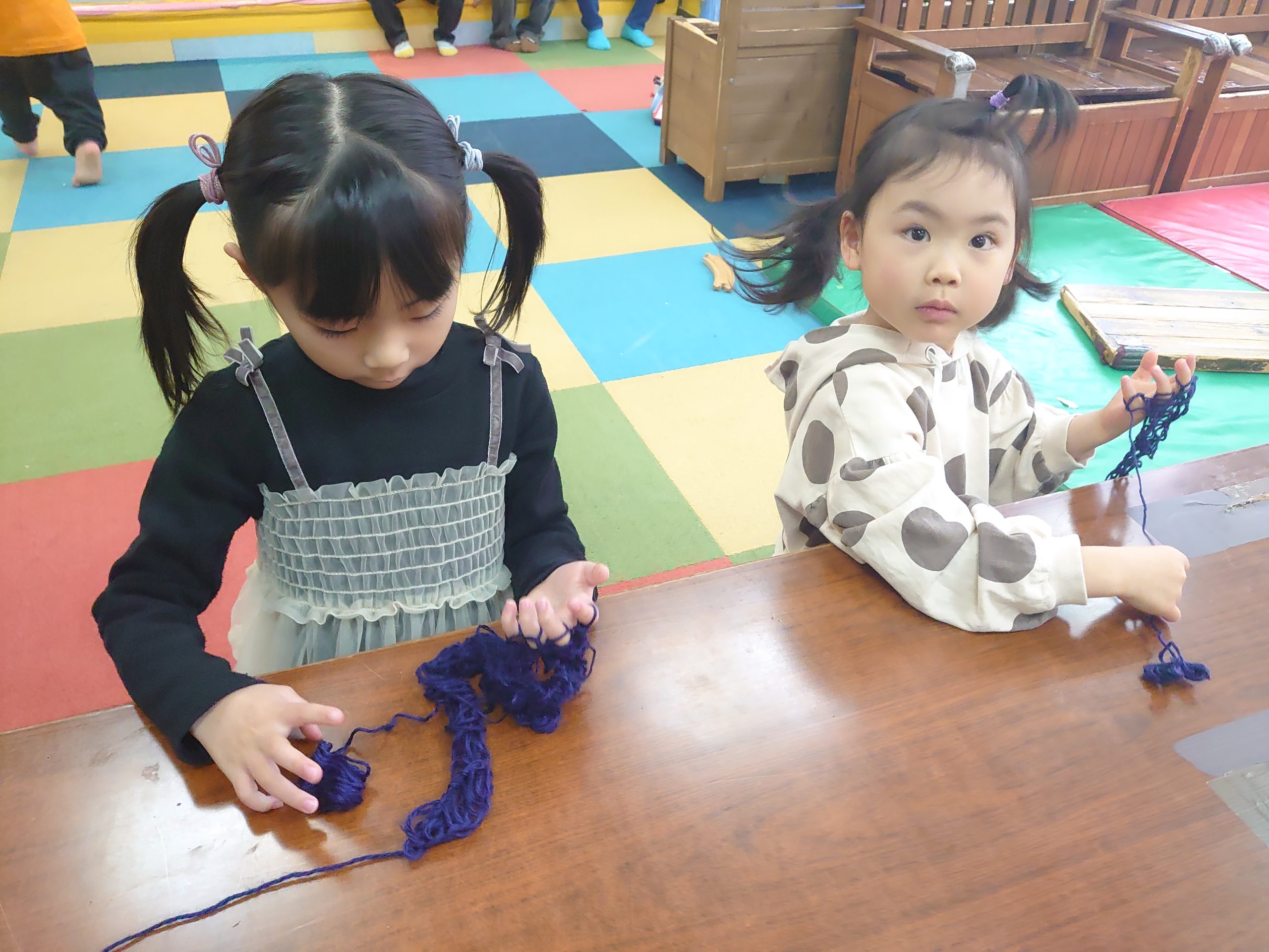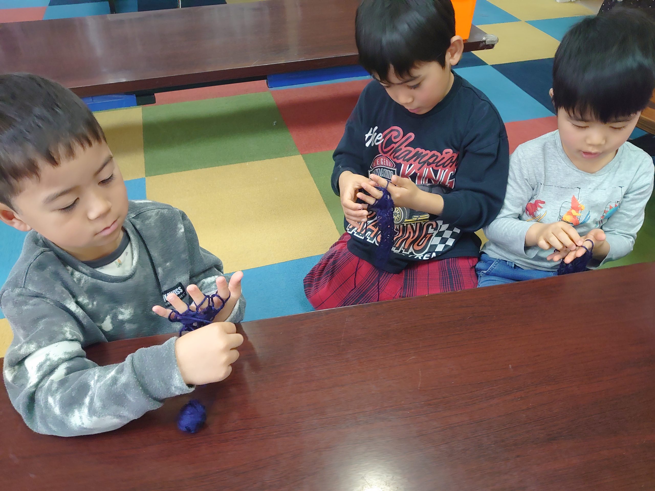 指編み1週目は、年中クラスで得意な子と年長クラスが先生の指導の元で行いました。最初は難しく感じるのですが、やり方さえ理解すれば同じ事を繰り返すのみなので、集中して職人のようにこなしていく様子がありました。