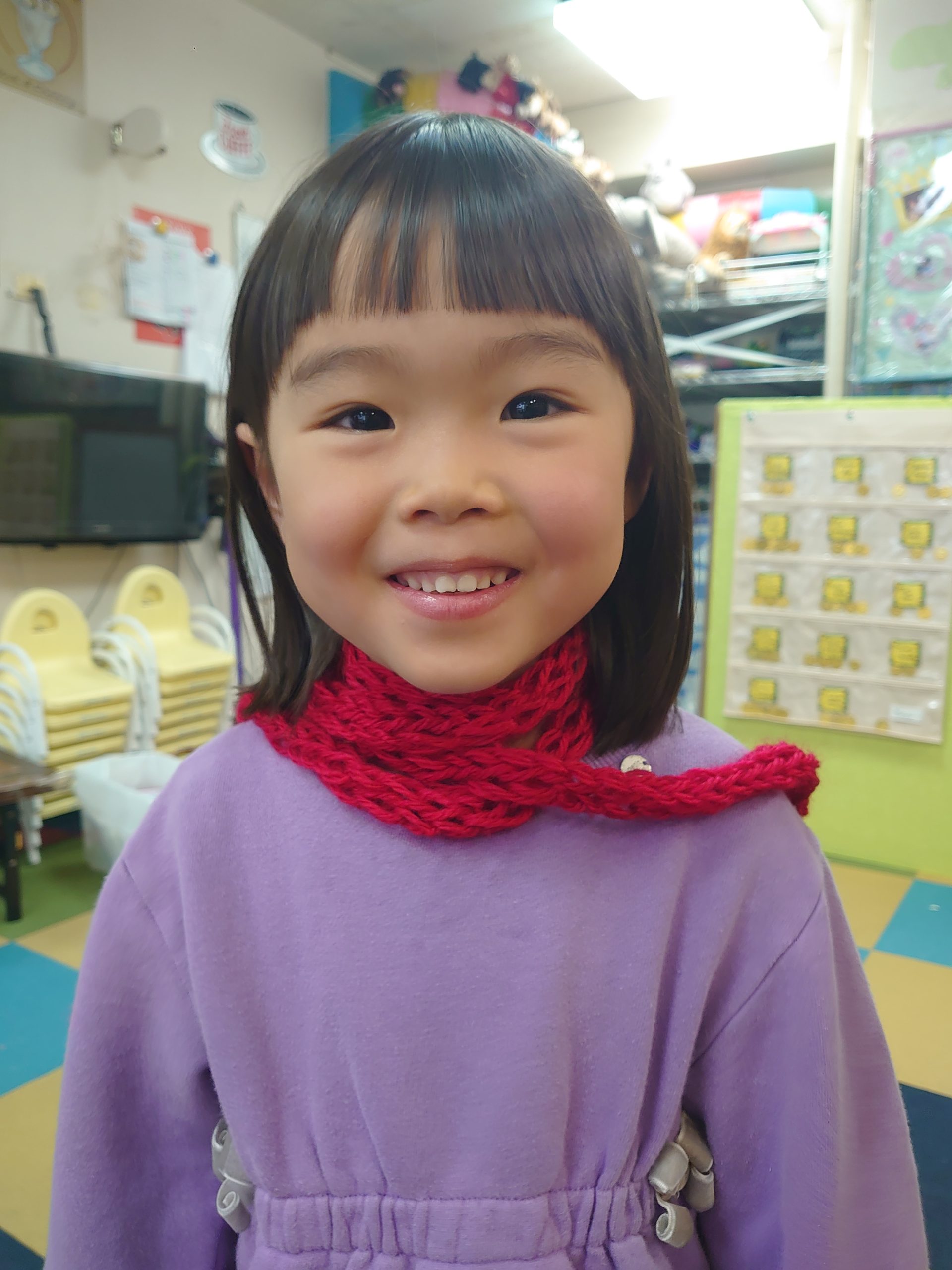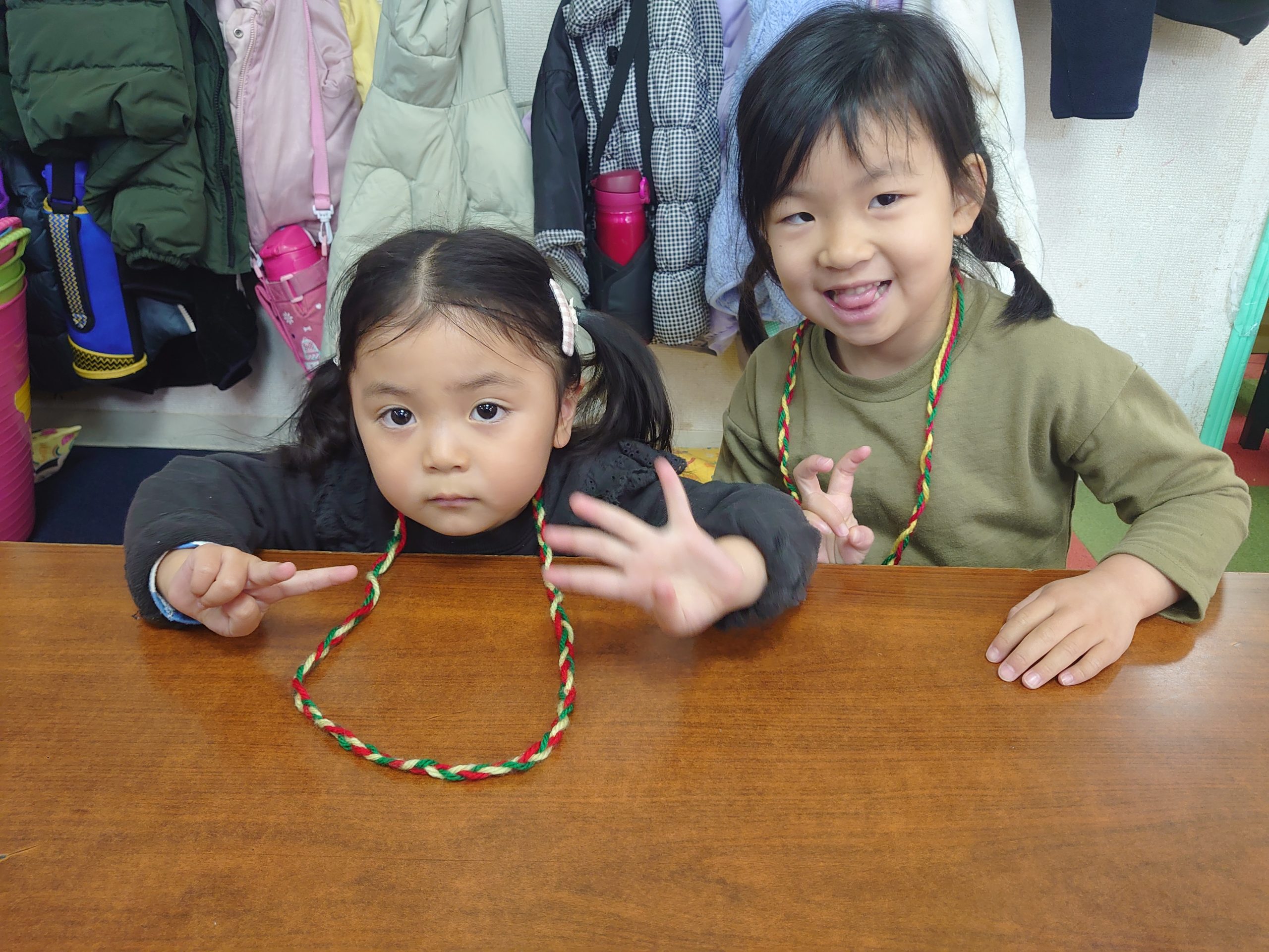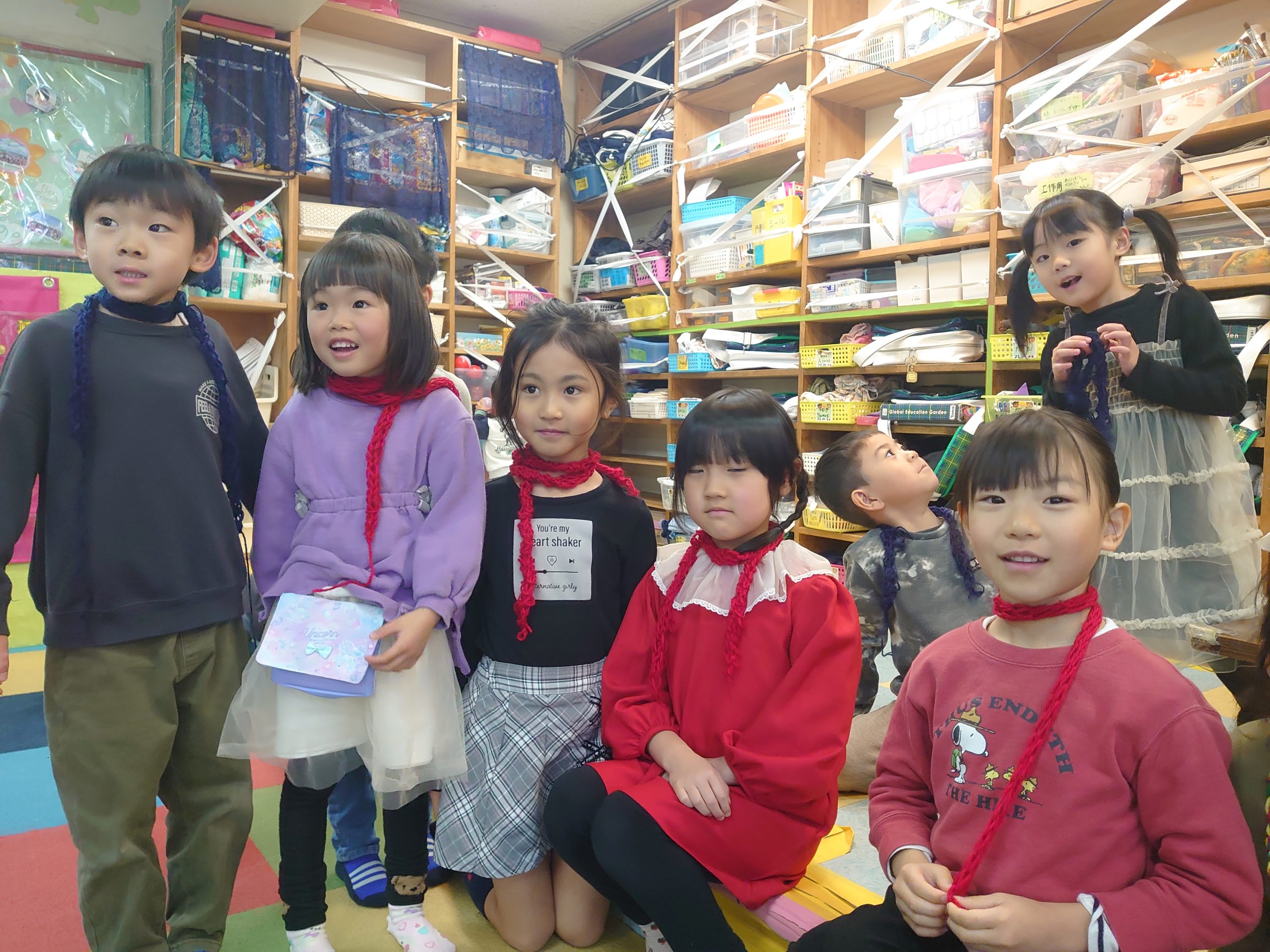 工作の後の英語レッスン中も自分で編んだ指編みマフラーを首にかけて授業を受けている子どももいました。お家でもやりたい!というお子さんには、どうぞ気の済むまで指編み体験させて下さいね。