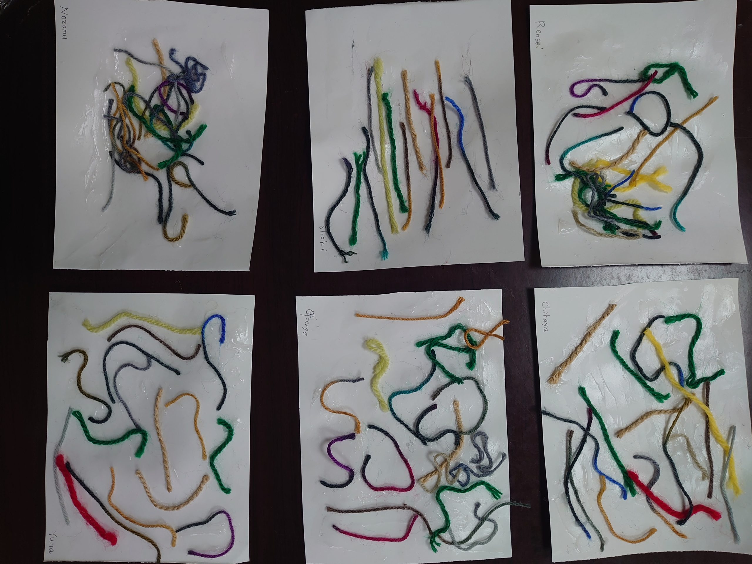 ひよこクラス、うさぎクラスは画用紙に空けた穴に糸通しをしました。一番年齢の低い園児でも先生と一緒に糸を通すとやり方を覚え、自ら穴に糸を通して見せました。2週目は、好きな糸を画用紙に糊で張って作品を完成させました。とってもかわいい芸術作品となりました。