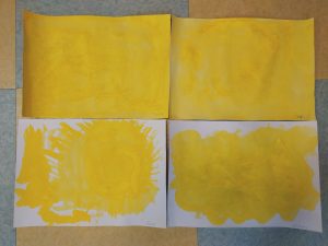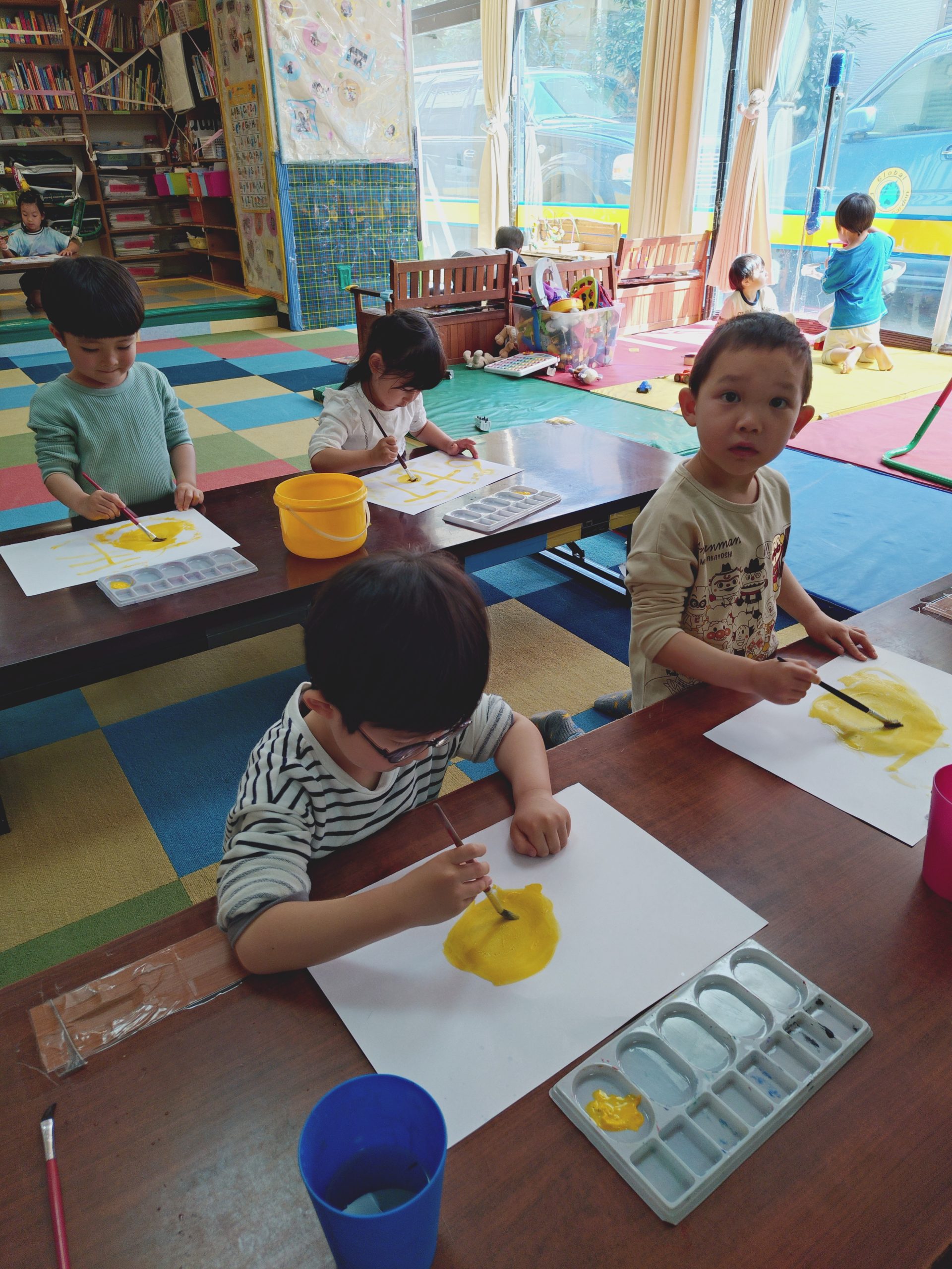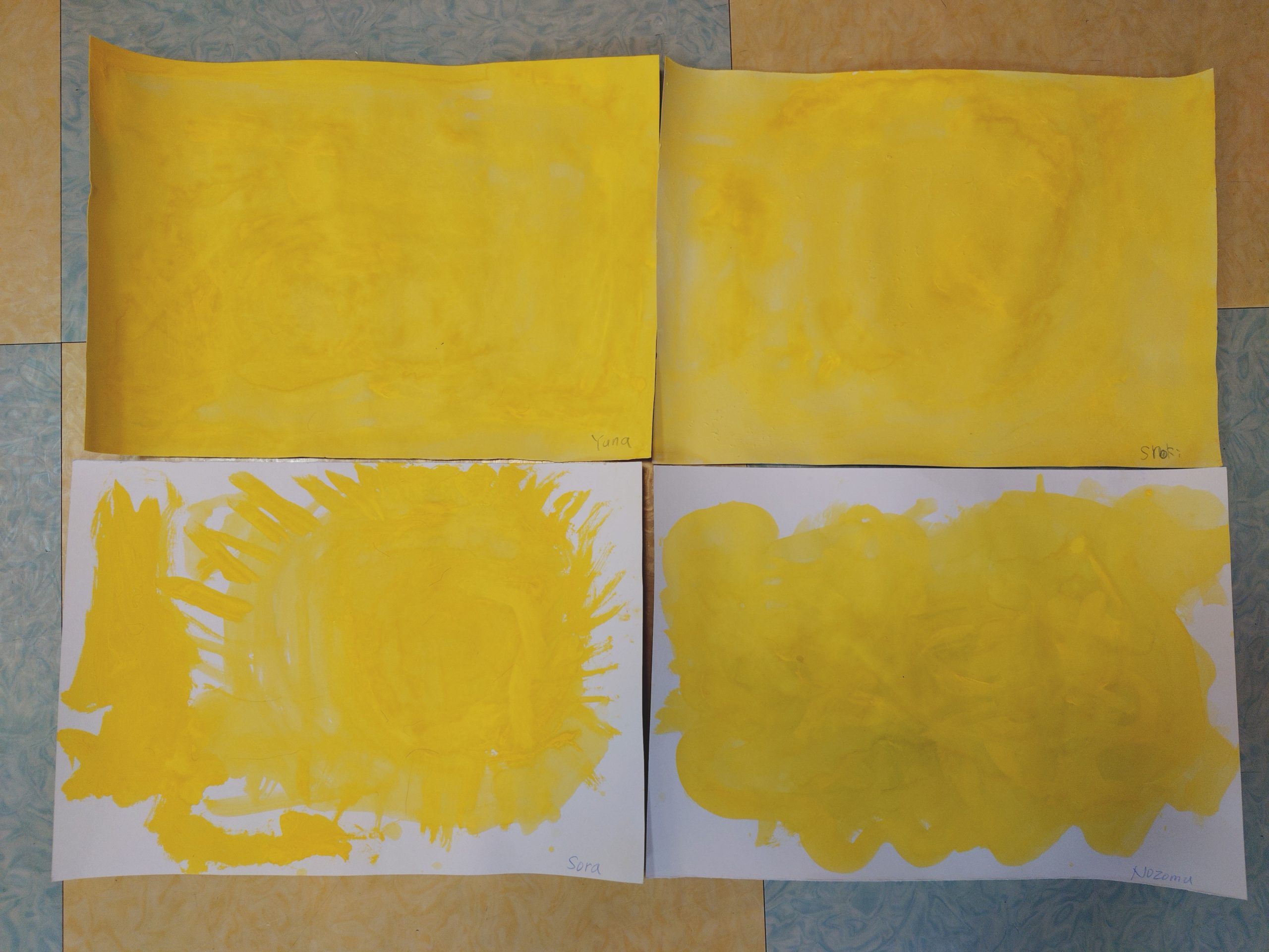年中クラスは、絵の具1色で筆の動き、水分量、絵の具ののり方を味わう事を体験しました。子供達に、今日の気持ちを聞くと、全員が楽しい!と答えたので、黄色を選び描きました。ただ1色ですが、その子らしい感性が絵の具の動きとなって表れてると思います!