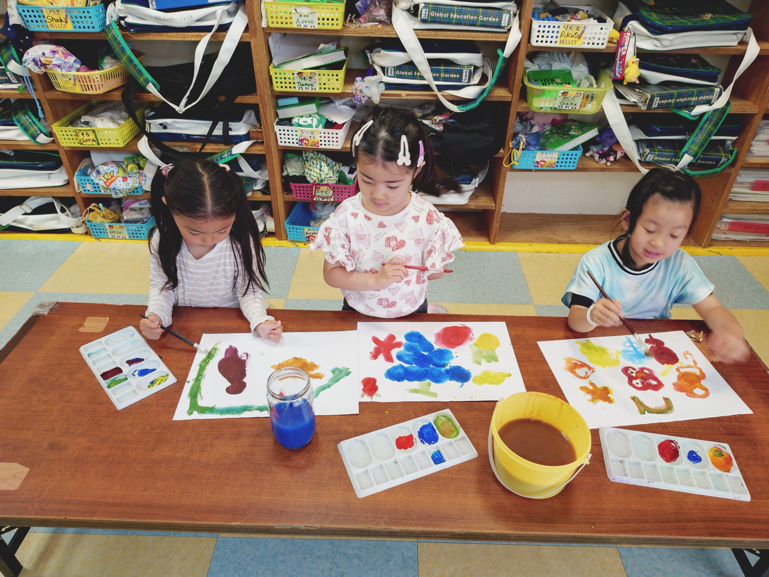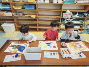 年長クラスは、絵の具道具の使い方の説明から始め、三原色を使ってどんな発見があるのか、色を体験してね。と課題を与えました。