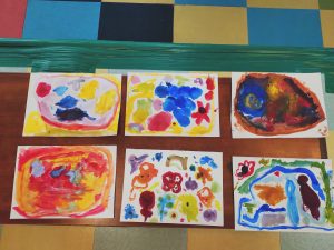 描き終わったら、パレットや筆、水入れを洗い、片付けまでして終わりました。最後に、今日の工作の感想を聞くと、色を画用紙にのせるのが楽しかった、という思いが多くありました。家で絵の具体験ができる人はしてね、と声がけしてます。