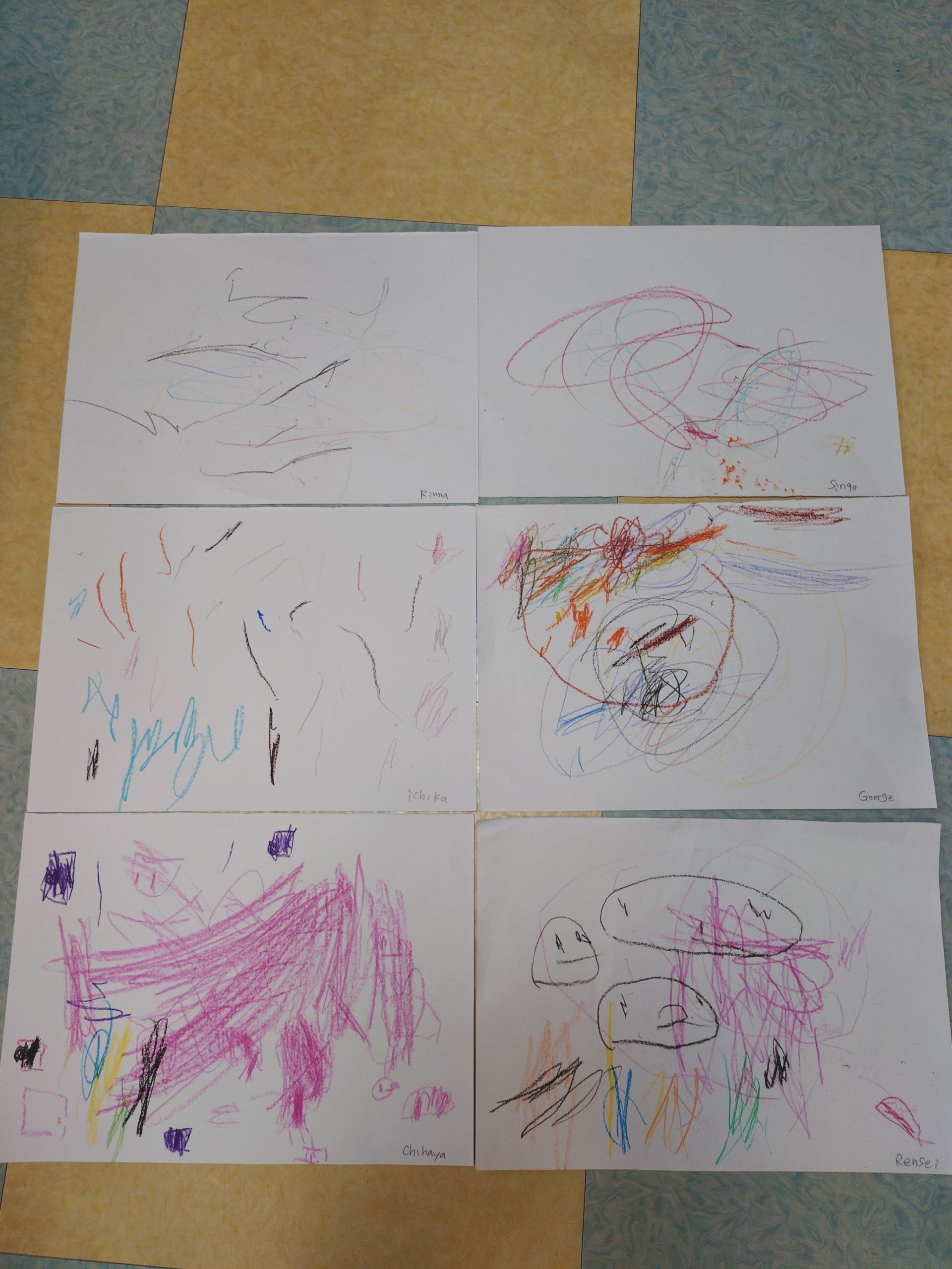 うさぎクラス、年少クラスはクレヨンを使って自由に描きました。年少クラスには、色んな色を使うという課題を与えました。どんな色を選んで描いたのか見てあげて下さい😊
