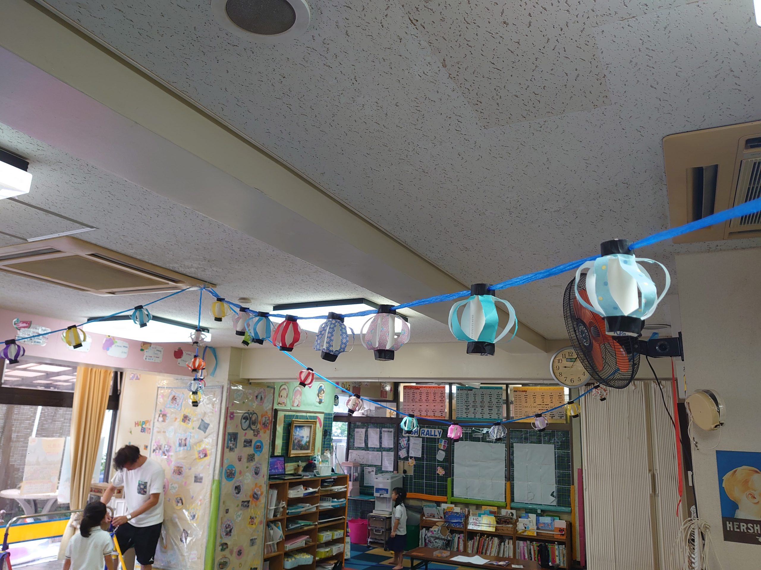 完成した、ちょうちんを天井に四方にぶら下げると、私のは〜?誰々のはこれー。と作品を見つめる様子がありました。夏祭りまで飾ってから持ち帰りを致します。